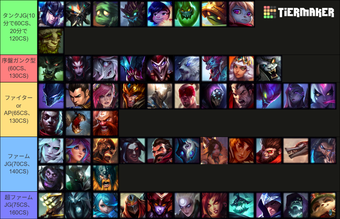 ファームJGの中でも特に終盤に強いチャンピオンやキャリー力のあるチャンピオンは超ファームJGと分けてみました!超ファームJGは最低でも75CS~160CSぐらいがキャラの性能を引き出しやすいと思うんですが、正直80CS、180CSくらい取っても良いと思います。