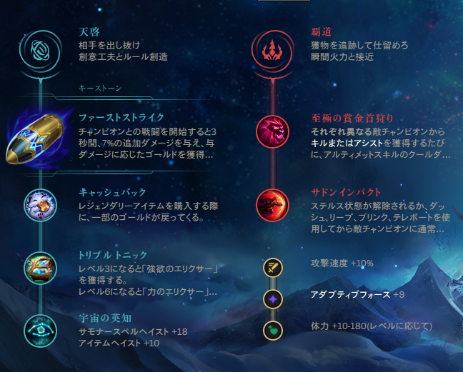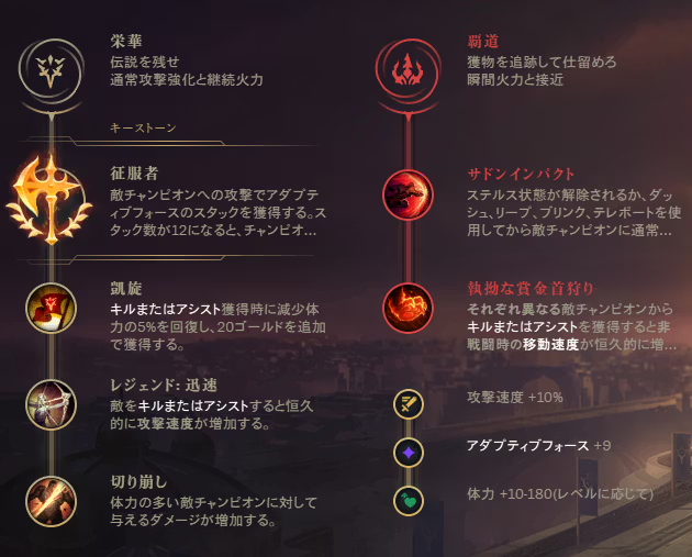 一番強い間違いないルーン。「征服者」を選ぶことで敵をアサシンするだけではなく、集団戦でも活躍しやすくなる。