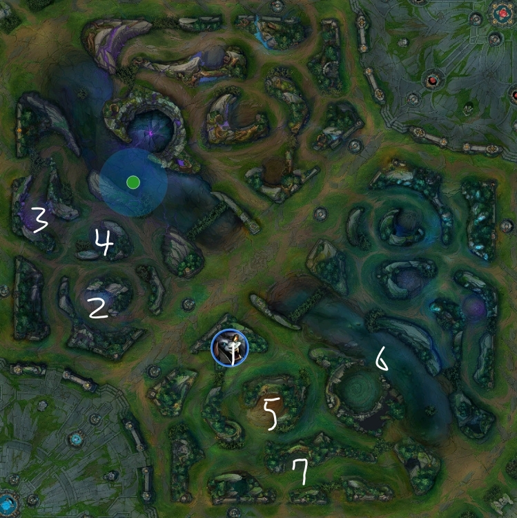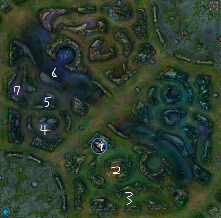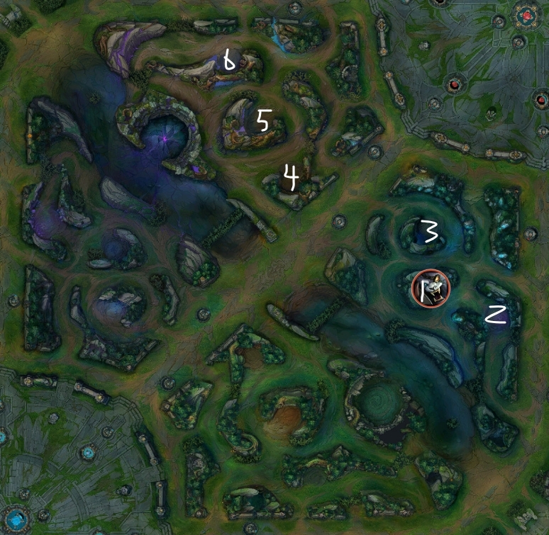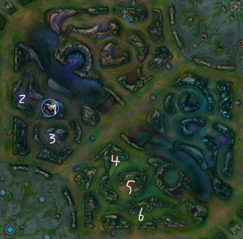 このルートをする場合は、レベル1で相手のバフにワードを置いてスタート位置を特定してから、ポーションを買ってレベル2でEを取って最速でJGを狩る必要がある。