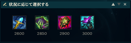 相手にアサシンが2体以上いる場合や、近接攻撃で自分に仕掛けてくるチャンピオンが多い場合は2コア目にゾーニャを買っても良い。2コア目に防御アイテムを買うと火力不足にはなるが、生き残ることで結果的には味方の為になったり、ダメージが出ることが多い。